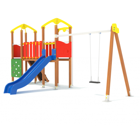 Parque infantil con dos castas con tejado, tobogán, rocodromo y columpio con asiento normal.
