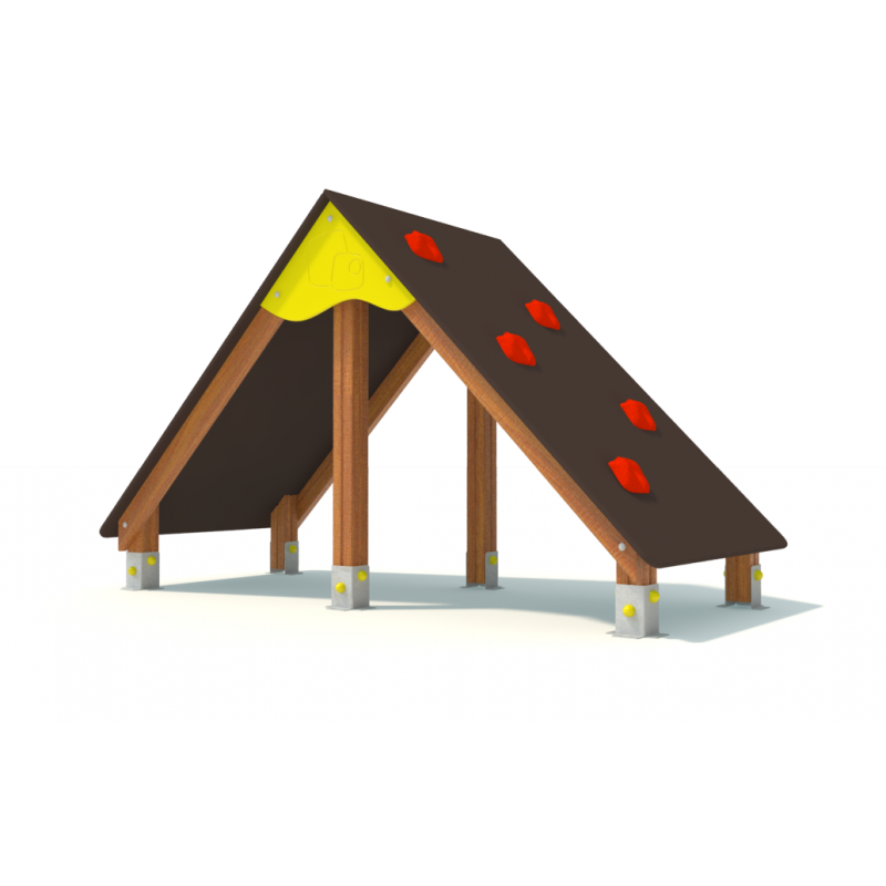 Casita de dos aguas para poder escalar en su tejado , realizada en madera tratada para su uso al exterior.