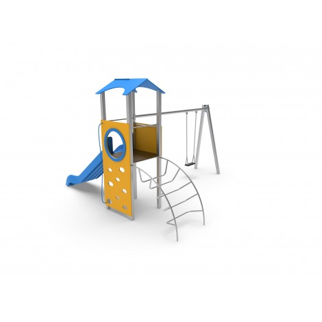 Torre con tobogan rocodromo, arco de acceso y columpio.
