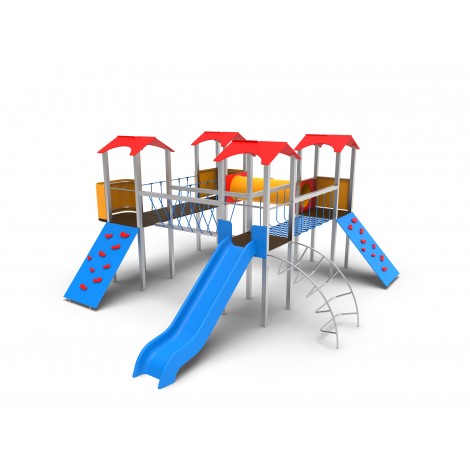 cuenta con dos toboganes, balcon, escalera de arco, rampa rocodromo..