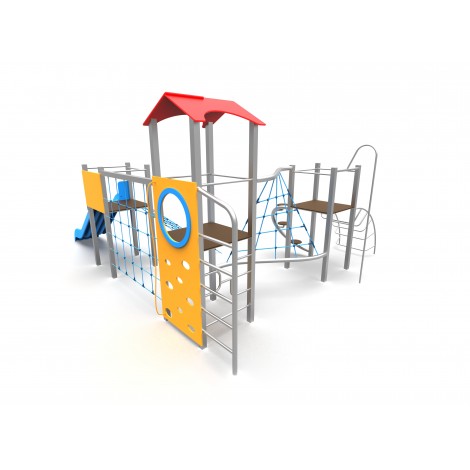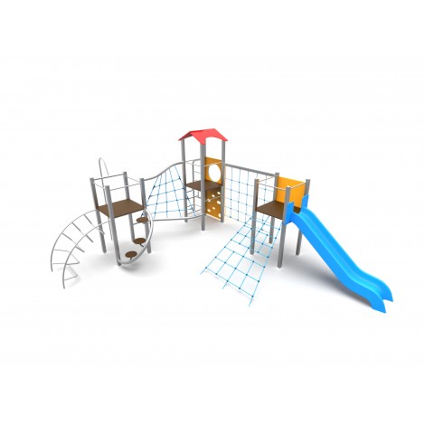 cuenta con tobogan, barra de bomberos , panel rocodromo y malla de cuerdas.