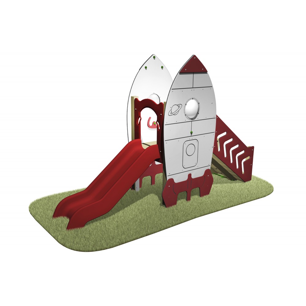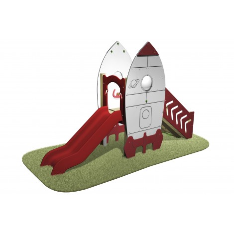 Tobogan con forma de cohete con rampa de acceso y deslizadera en polietileno.